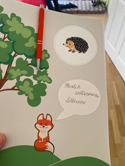 - Liebevolle Organisation: Erster Tag, wir betreten das Gebäude. Wir bekommen eine persönlich gestaltete Laufmappe mit allen Infos inklusive Kugelschreiber und Lillemor erhält den Plüschfuchs Filumi, der ein Halstuch mit ihrem Namen trägt! Lille liebt Kuscheltiere und war absolut glücklich. Kurzer Blick auf den kleinen großen Bruder. Er trägt es mit Fassung. Über eine kleine Überraschung nur für ihn hätte er sich sicher auch gefreut.