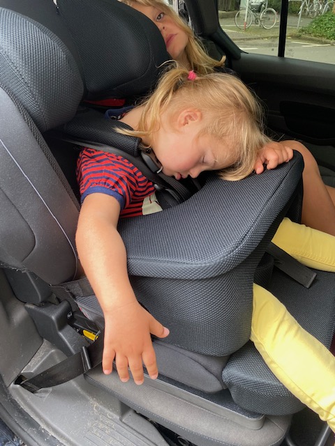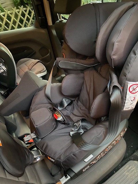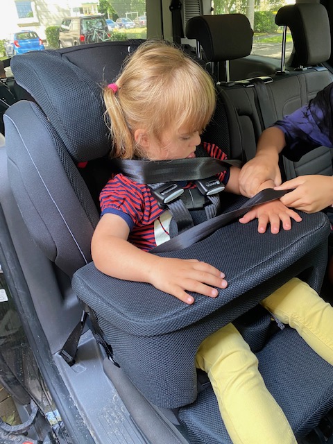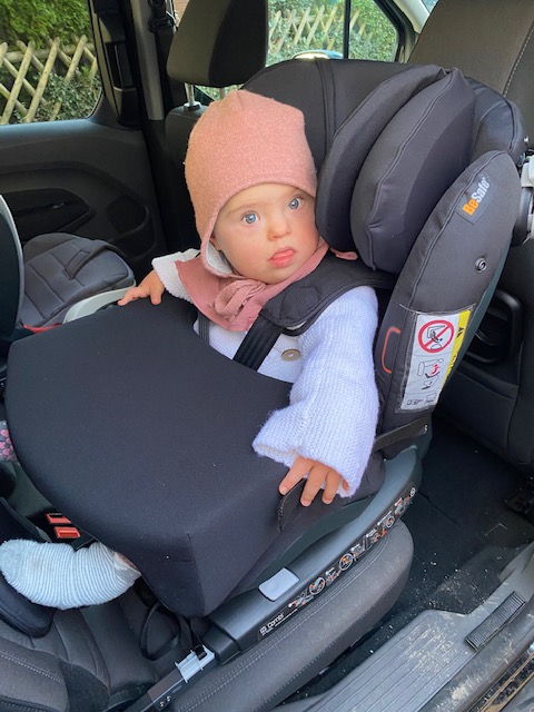 Lillemor ist aus ihrem ersten Sitz mittlerweile heraus gewachsen und erhielt vor etwas mehr als einem Jahr die Empfehlung für einen weiteren Reha Kinderautositz. Dafür kam die Beraterin vom Sanitätshaus mit mehreren Sitzen zu uns nach Hause, Lille konnte in unserem Auto Probe sitzen. Ihr aktueller Sitz ist der Recaro Monza Nova Reha, er ist für Kinder bis 50 kg geeignet und wird uns nun noch länger begleiten. Lillemor hat dort einen Fünf-Punkt-Gurt mit Gurtsicherung. Bei handelsüblichen Sitzen stoßt ihr mit dem Wunsch nach einem Fünf-Punkt-Gurt schnell an Grenzen, ab einer gewissen Gewichtsklasse gehen die Autositz-Hersteller davon aus, dass die Kinder den Dreipunkt-Autogurt verwenden. Damit würde Lille aber im Schlafen mit dem „Kopp auffe Knie“ liegen. Geht leider gar nicht. Sie benötigt mehr Stabilität. Lillemors Sitz ist auf einer Drehplatte montiert, sie kann nämlich nicht selbst ins Auto einsteigen, und so muss ich nicht 22 kg, um die Ecke in den Sitz heben. Sehr komfortabel. Wir haben zusätzliche eine Fußstütze beantragt, die sie nutzen wird, denn sie größer wird. Außerdem eine Unterarmauflage. Die ist Gold wert, denn zum ersten Mal hängt Lille im Schlafen nicht bedrohlich mit dem Kopf auf ihrem Schoß. Wir nennen die Auflage „Tisch“, sie eignet sich gut zum Spielen und gibt ihr auch im wachen Zustand Halt. Die Drehplatte ist per Isofix mit dem Auto verbunden, der Sitz selbst ist mit Klettband auf der Drehplatte montiert. Das ist vom Gedanken her gewöhnungsbedürftig, allerdings vom TÜV geprüft und zugelassen. Ein kleines Extra sind die Lautsprecher in der Kopfstütze, die sich per Klinke, zum Beispiel mit der Tonie Box verbinden lassen. Haben wir auf langen Fahrten schon genutzt. Lille hört die Töne gut, wir nicht. Perfekt, damit alles etwas unterschiedliches hören können und sicher auch für Kinder, die etwas zur Beruhigung benötigen. Letztendlich entscheidet sich jede Familie individuell aus individuellen Gründen (Platzangebot im Auto, Bedürfnisse des Kindes, etc.) für ein Model.